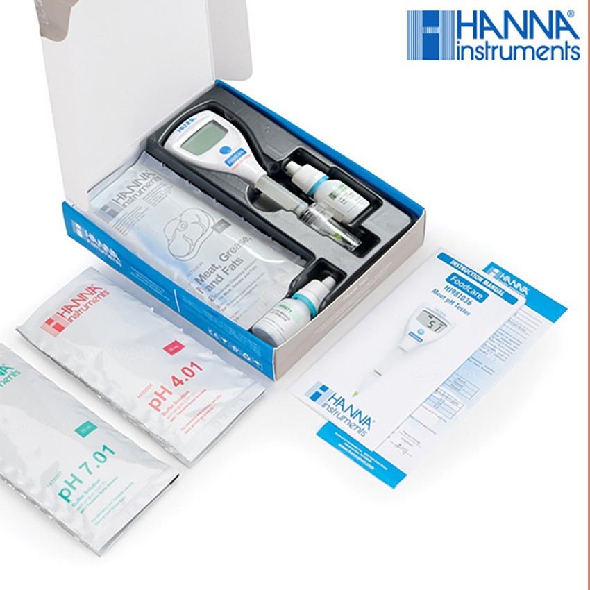| Paket İçerisi | 1 adet Hanna 981036 et pH ölçer cihazı 2 adet pH 4.01 tampon çözeltisi poşeti 2 adet pH 7.01 tampon çözeltisi poşeti 2 adet et gres ve yağlar için asit temizleme solüsyonu poşeti 1 adet Hanna HI9071 jel köprülü elektrolit 1 adet Hanna HI9072 elektrot depolama çözeltisi 1 adet CR2032 pil (cihaz içerisinde) Kullanım kılavuzu ve kalite belgesi |