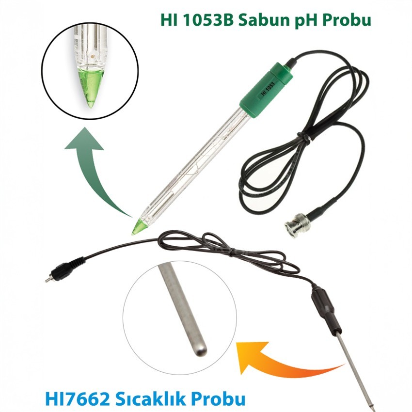 - HI 1053B sabun pH metre probu, cam gövdeli, yeniden doldurulabilir, çift bağlantılı pH elektrotudur. Bu elektrot, dış referans hücresinde üçlü bir seramik bağlantı noktasına sahiptir ve pH algılama kısmı yüksek sıcaklığa dayanıklı (-5 ile 100 °C) camdan yapılmıştır.