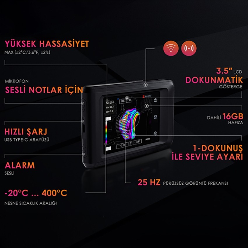- Termal görüntüleri görüntülemek için siyah sıcak, beyaz sıcak, kırmızı sıcak, gökkuşağı, demir, füzyon ve yağmur olmak üzere yedi farklı renk paleti de mevcuttur.
