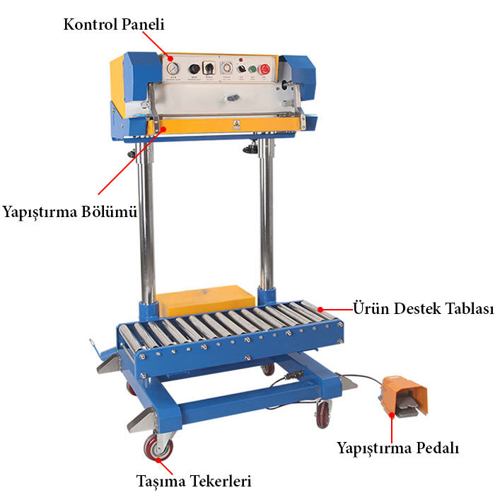 - Yapıştırma makinasının alt bölümünde bulunan tekerleri ile makinayı bir yerden diğer yere kolaylıkla yürüterek götürebilirsiniz.