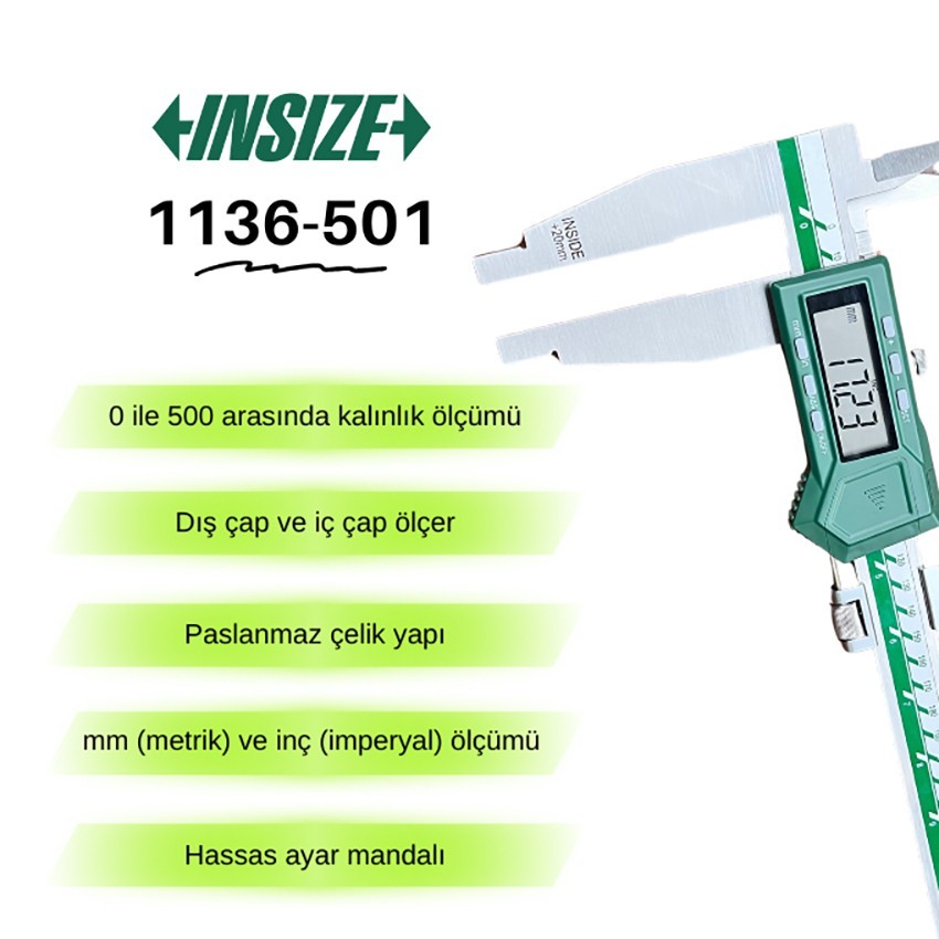 0 ile 500 mm ölçüm aralığına sahip bu İnsize 1136-501 kodlu profesyonel dijital kumpas, yüksek hassasiyetli yapısı, dayanıklı paslanmaz çelik gövdesi ve gelişmiş ABS teknolojisi ile endüstriyel ölçüm süreçlerini en üst seviyeye taşımayı hedefler.