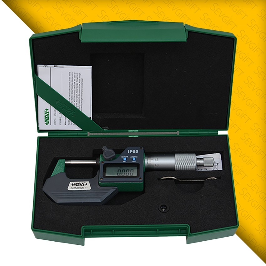- Insize 3108-25A dijital mikrometrenin; yeşil renkli, darbelere dayanıklı sert yeşil plastik çantası bulunmaktadır.
