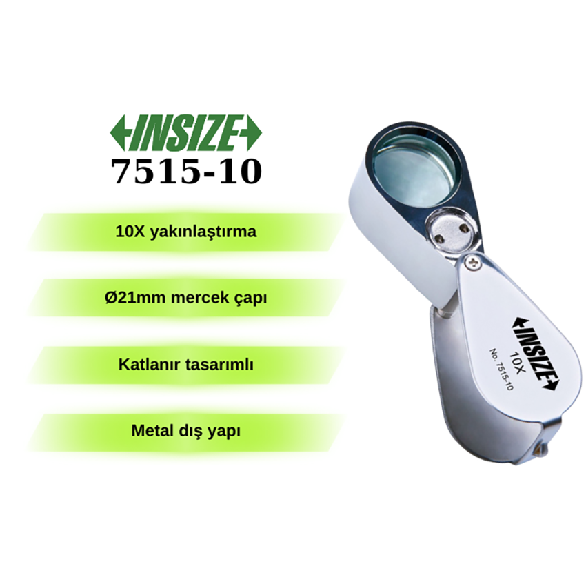 - Insize tarafından üretilen katlanabilir bu büyüteç (7515-10), cam merceği ve 3 adet LR927 pil ile çalışan yapısıyla dikkat çekmektedir.