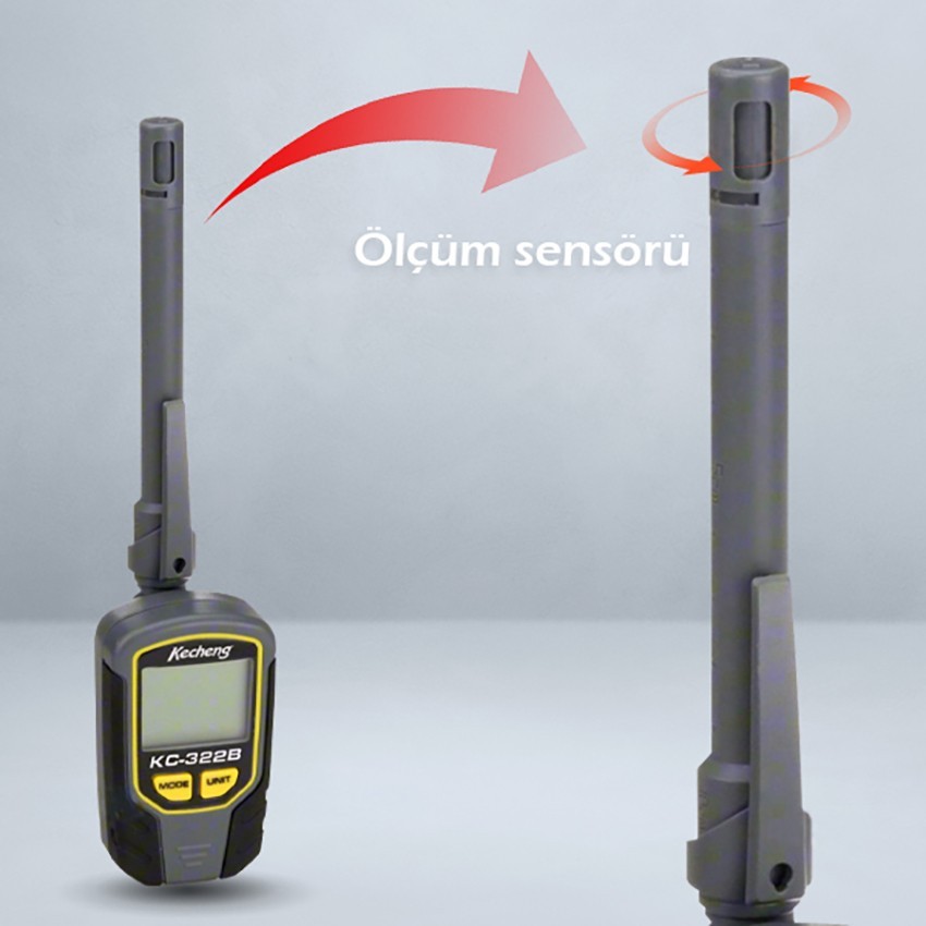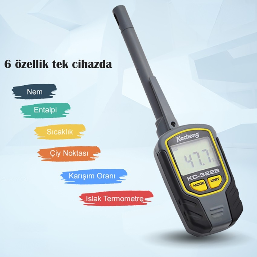 Kecheng KC-322B termo higrometre, ortam sıcaklığı, nem oranı, çiylenme noktası sıcaklığı, yaş termometre sıcaklığı, karışım oranı ve entalpi gibi çevresel parametreleri profesyonel olarak ölçen, dijital bir sıcaklık ve nem ölçüm cihazıdır. Kullanıcı dostu iki butonuyla iç mekanlarda, laboratuvarlarda, seralarda, depolarda ve endüstriyel alanlarda hassas ölçümler yapar.