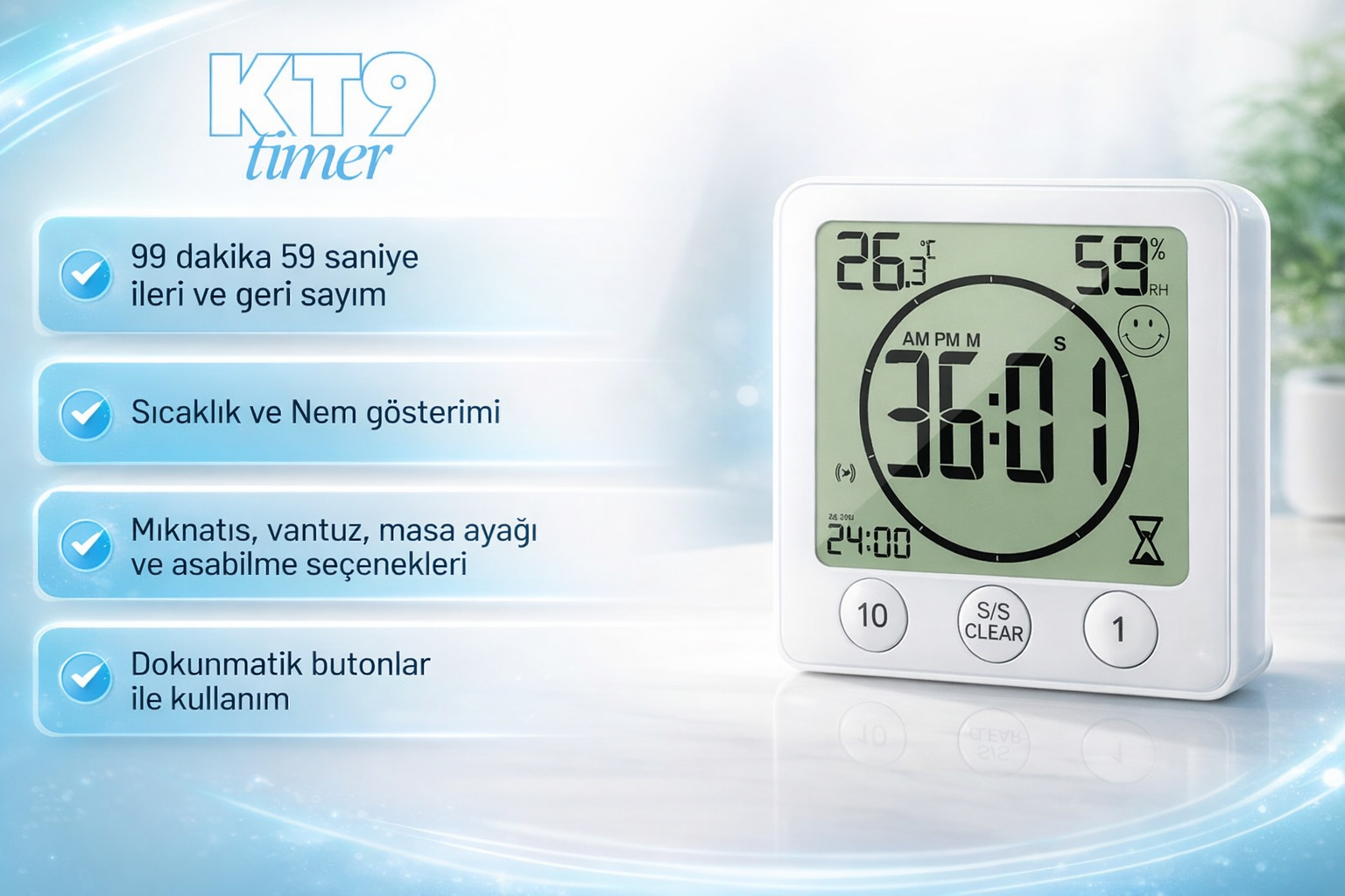 Ortam iklimlendirme takibi ve zaman yönetimini birleştiren KT9; sıcaklık, nem, zamanlayıcı ve saat fonksiyonlarını dokunmatik bir arayüzde sunar. Vantuzlu veya mıknatıslı sabitleme sistemi, cihazın metal veya pürüzsüz yüzeylerde güvenle konumlandırılmasını sağlayarak ergonomik ve profesyonel bir kullanım deneyimi yaratır.