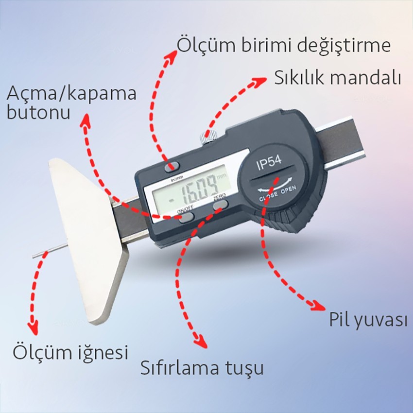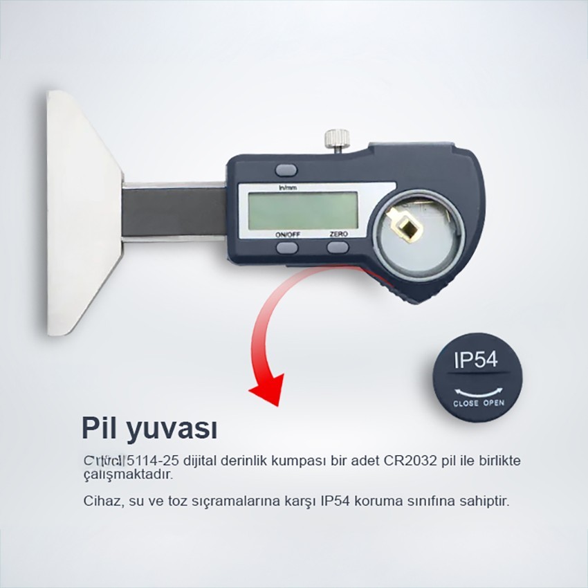 5114-25 lastik derinlik kumpası, bir taşıt lastiğinin diş derinliğinin ne kadar olduğunu belirlemek için kullanılan dijital ölçüm cihazıdır. Lastiklerin düzenli ve doğru bir şekilde aşındığını kontrol etmek, güvenli sürüş ve lastik ömrünü uzatmak acısından önemlidir.