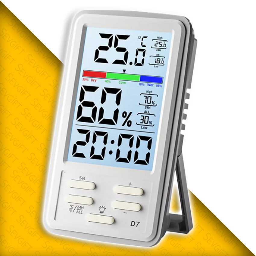 D7 sıcaklık ve nem ölçer, iç ortamın sıcaklık, nem ve saat bilgilerini ekranda gösterir. Konfor göstergesi, arka ışıklı ekranı ve MAX/MIN hafızasıyla ev ve ofislerde ortam takibini kolaylaştırır.