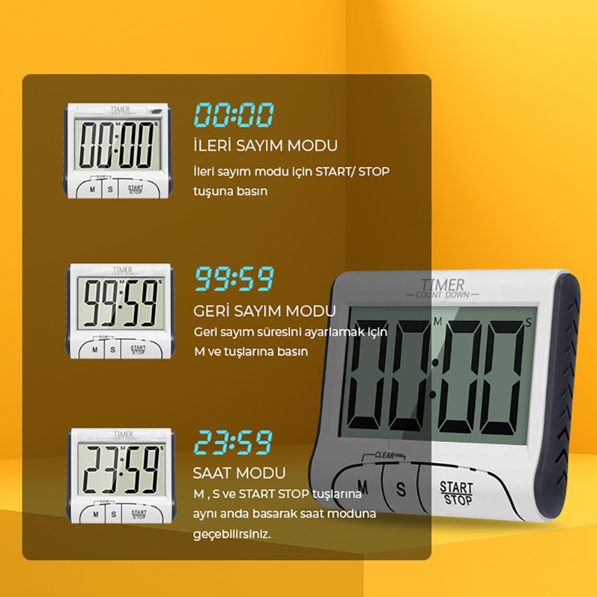 - Bu dijital zamanlayıcı cihazı güçlü alarm sesine sahiptir. Kurduğunuz geri sayım bittiğinde yüksek sesli alarm devreye girer.