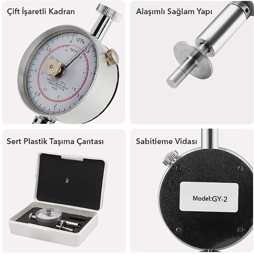 GY-2 penetrometre meyve sertliği ölçüm cihazı; meyvenin olgunluğunu kontrol etmek için kullanılan 0.5 . . . 4 kg / cm² kapasiteli meyve sertlik ölçerdir. Olgunluk meyve rengi, şekli ve sertliğine göre belirlenebilir.