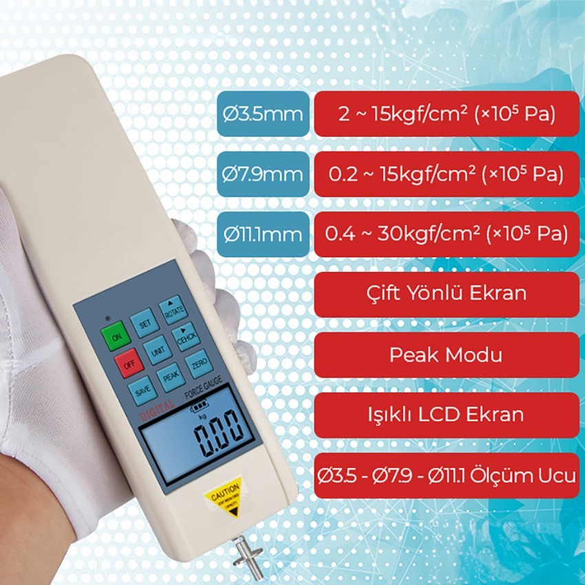 - Bu meyve sertlik ölçüm cihazının en büyük özelliği Ø11.1 mm - Ø7.9 mm ve Ø3.5 mm olan 3 farklı baskı uçlarının hepsine sahip olmasıdır.