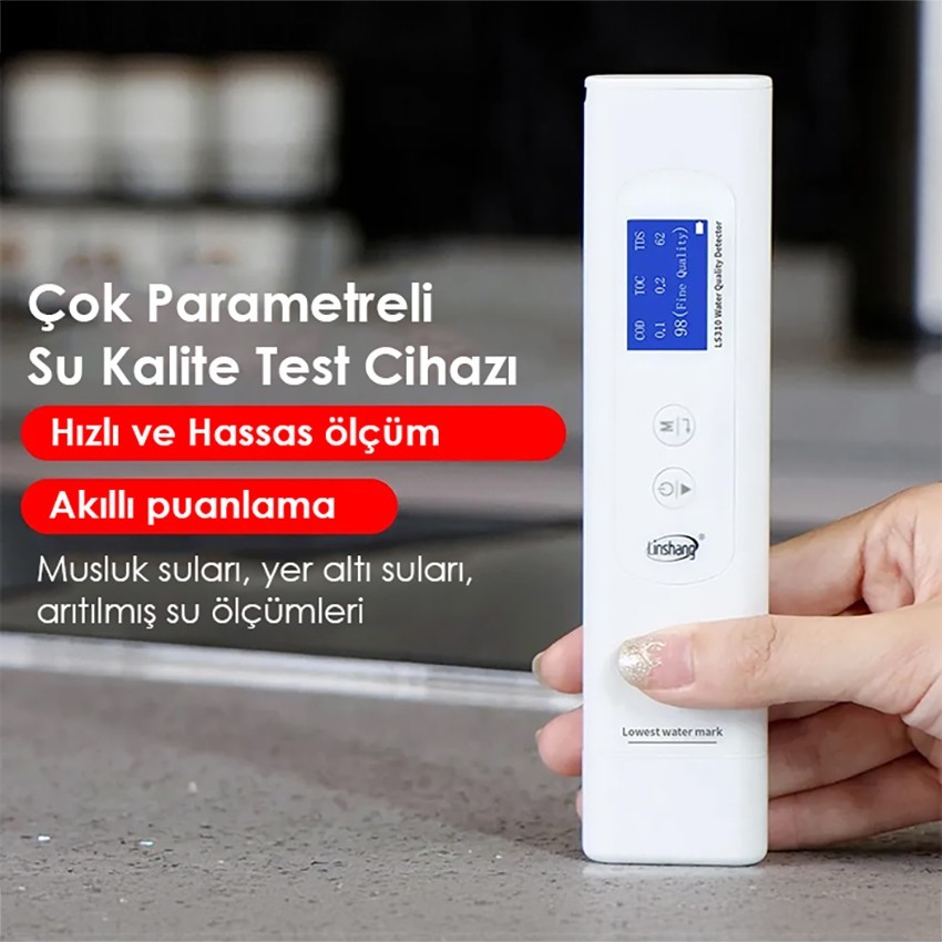 - Linshang LS310 ölçüm cihazı; COD (kimyasal oksijen ihtiyacı), TOC (toplam organik karbon), UV275 (ultraviyole absorbsiyon değeri), TDS (toplam çözünmüş katı madde), EC (elektrik iletkenliği) ve sıcaklık olmak üzere 6 su kalitesi göstergesini aynı anda ölçebilir ve su kalitesini kapsamlı bir şekilde değerlendirebilir.