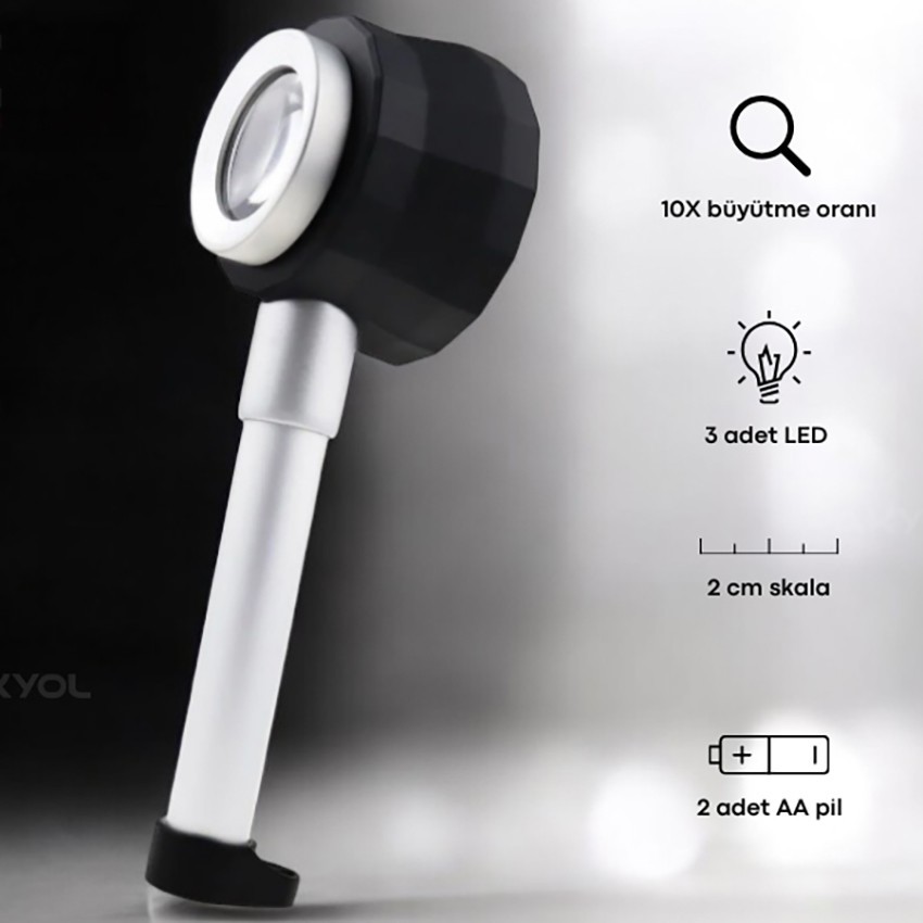 10X3L led aydınlatmalı pipo büyüteç; 10x yakınlaştırma yapabilen, cihazın alt bölümünde bulunan 3 adet Led ışığı sayesinde, ortamdaki ışık seviyesi düşük olsa bile rahatlıkla büyütme işlemini gerçekleştirebilirsiniz.