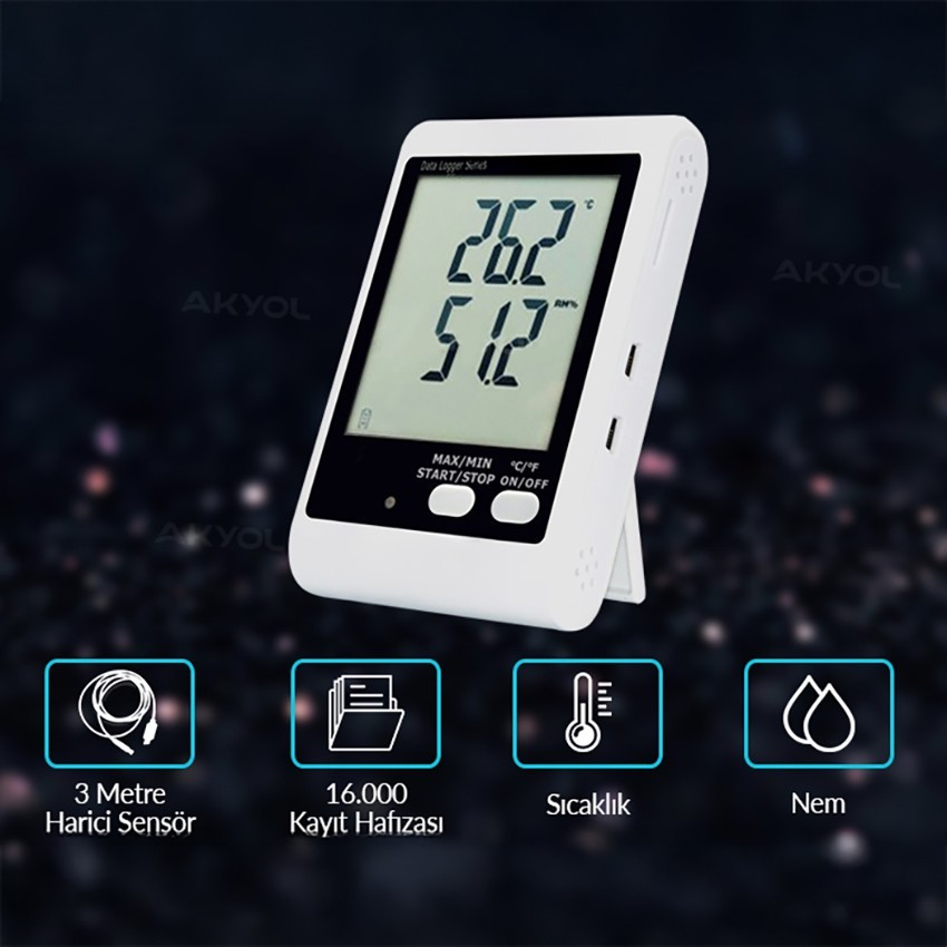 20E Sıcaklık ve Nem Kayıt Cihazı Datalogger; 16000 adete kadar sıcaklık ve nem kaydı yapabilen,