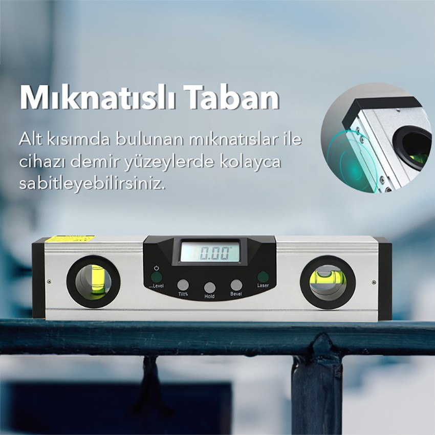 Dasqua 8400-0000 açılır ekranlı dijital eğim ölçer cihazı ergonomik boyutları ile kolay taşınabilir, alt kısmında bulunan mıknatıs ile metal yüzeylere sabitlenebilir mini eğim ölçer cihazıdır.