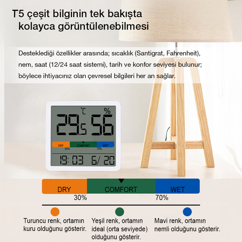 Ölçtüğü sıcaklık ve nem değerlerini LCD ekranında net bir şekilde gösterirken, ekrandaki grafik barı da mevcut değerlere göre dinamik olarak değişim gösterir.