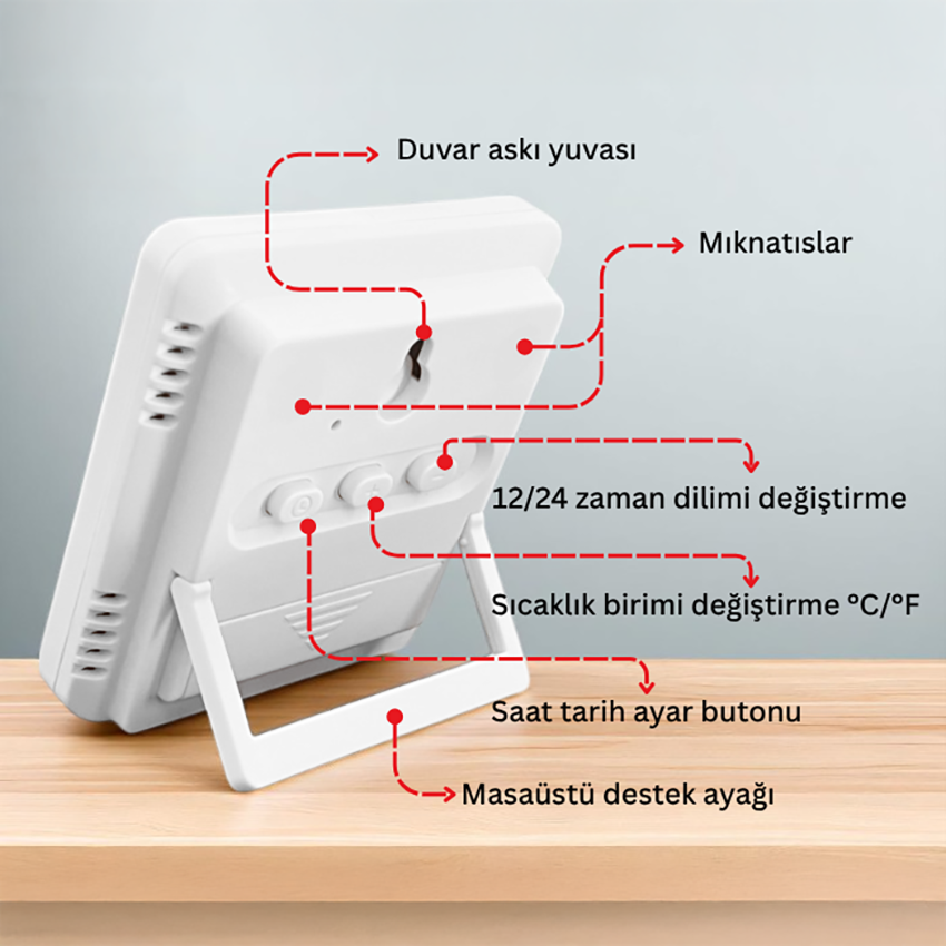 - Cihazın arkadasında bulunan "-" butonu yardımıyla saat formatı 12 saat veya 24 saat (AM/PM) olarak ayarlanabilir.