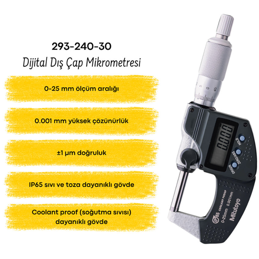 Mitutoyo 293-240-30 dijital mikrometre ile 0-25 mm arası 0.001 mm hassasiyetle ölçüm yapın. IP65 koruma, Japon kalitesi ve profesyonel kullanım için ideal dış çap mikrometresi.