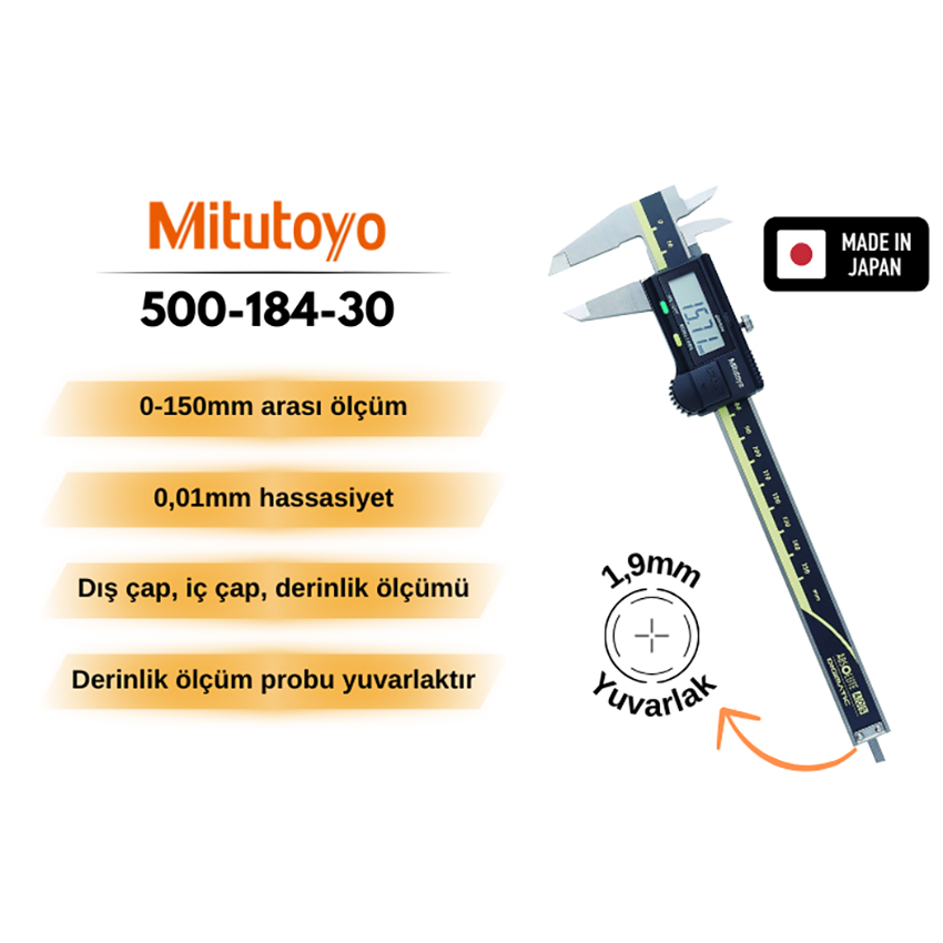 Mitutoyo 500-184-30 dijital kumpas; 0'dan 150 mm'e kadar ölçüm aralığı bulunan ve en önemli özellik olarak Ø1,9 mm ölçüsünde dairesel derinlik ölçüm çubuğu bulunan kumpas modelidir.