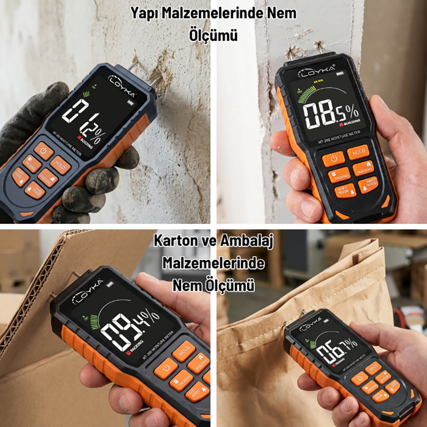 - MT-200, yalnızca ahşapta değil; çimento, sıva, alçı benzeri yüzeylerde kullanılabilecek Yapı Malzemesi (Building) modu da sunar. Bu sayede tadilat, yapı kontrolü, iç mekân nem takibi ve yüzey kuruluk kontrolü gibi uygulamalarda daha çok yönlü kullanım avantajı sağlar.