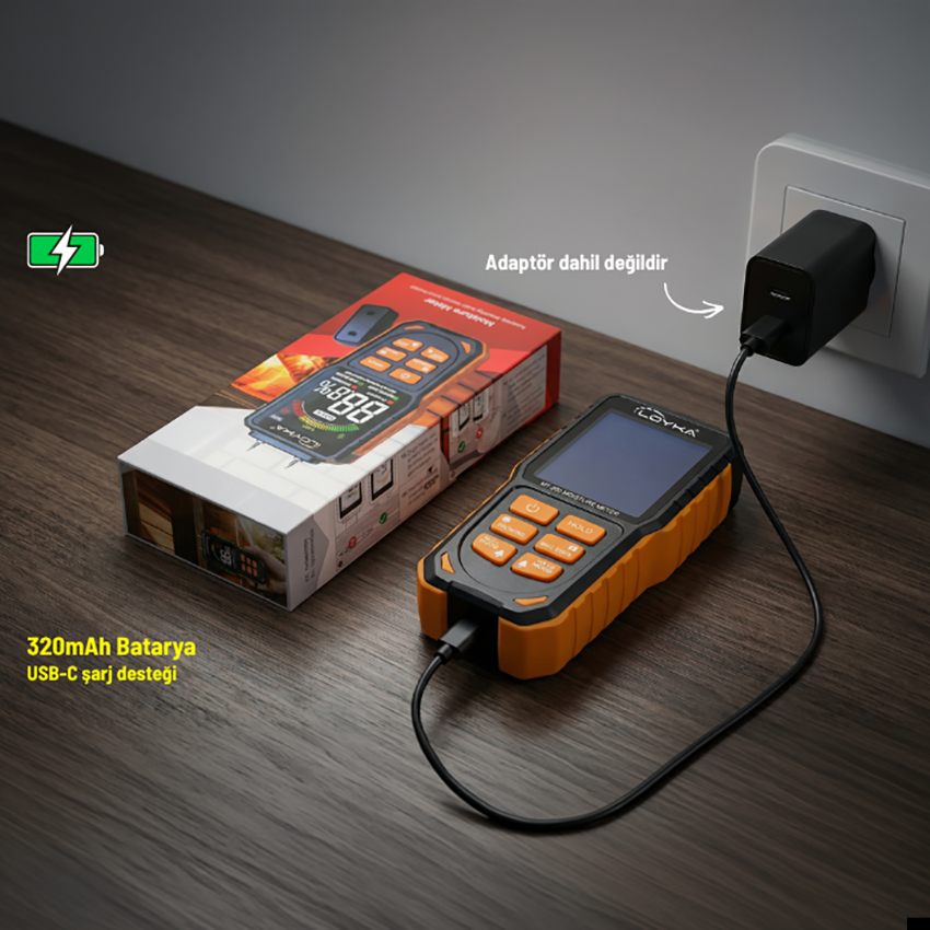 - 320 mAh dahili lityum batarya ile çalışır ve Type-C bağlantı üzerinden şarj edilir. Tek kullanımlık pil ihtiyacını azaltan bu yapı, saha ve atölye kullanımında daha pratik enerji yönetimi sunar. Düşük pil göstergesi sayesinde şarj ihtiyacı önceden fark edilebilir.