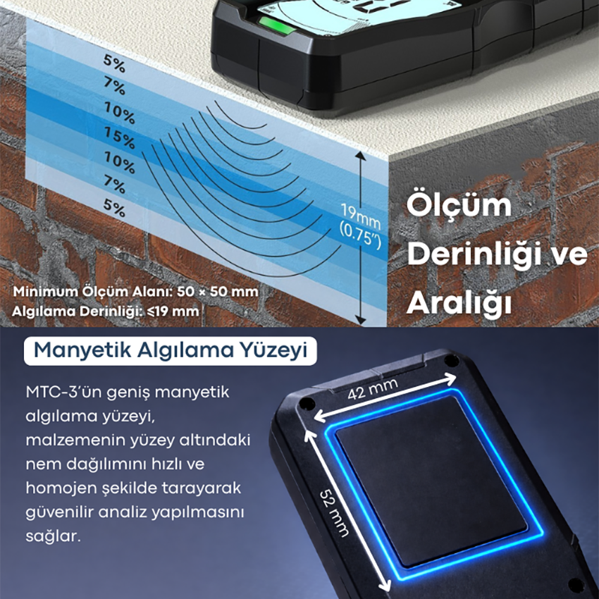- İndüktif modda ≤19 mm ölçüm derinliği ile yüzeye zarar vermeden alt katman nem analizi yapılabilir.