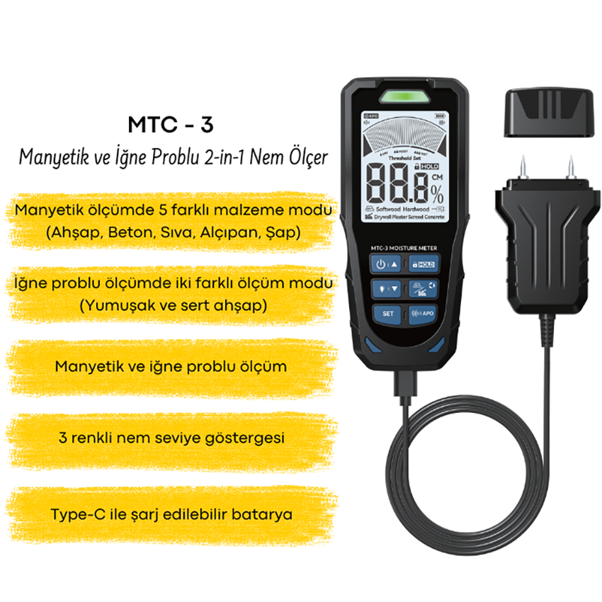 MTC - 3 Manyetik ve İğne Problu 2-in-1 Nem Ölçer Özellikleri