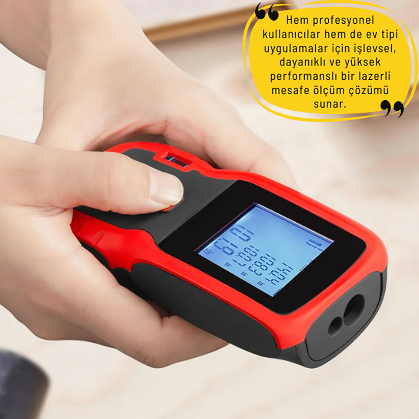 Lazer mesafe ölçer; 80 metreye kadar ölçüm mesafesi, iki adet dahili su terazisi ve gelişmiş kırmızı lazer teknolojisiyle donatılmış, alan, hacim ve Pisagor ölçümleri yapabilen bir lazermetre modelidir.