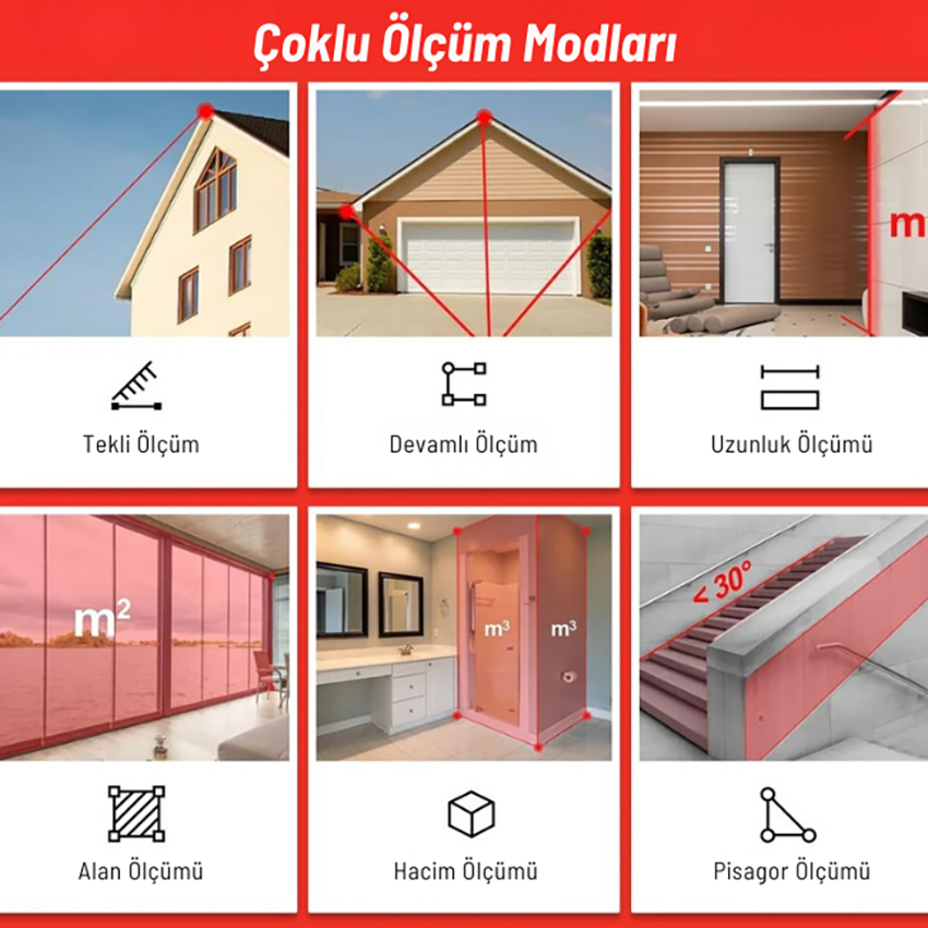 - Mesafe ölçümünün yanı sıra açı (pisagor) ölçümü, alan ve hacim hesaplama ile ölçülen değerleri toplama veya çıkarma gibi gelişmiş fonksiyonlarıyla farklı kullanım senaryolarına uyum gösterir.