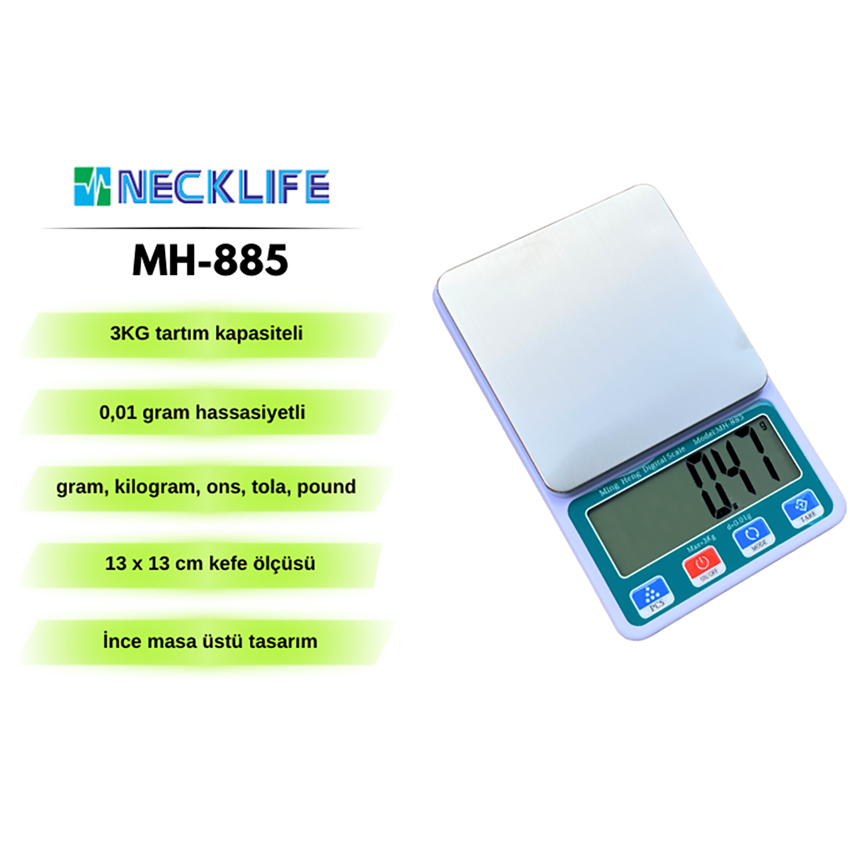 Markası Necklife olan MH-885 model dijital terazi, 3 kilograma kadar tartım kapasitesi ve 0,01 gram hassasiyetiyle dikkat çekmektedir. 13x13 cm ölçülerindeki terazi kefesi, kullanıcılarına geniş bir tartım alanı sunarken, ürünün yüksek hassasiyeti sayesinde en küçük ağırlıkları bile doğru bir şekilde ölçme imkanı sağlamaktadır.