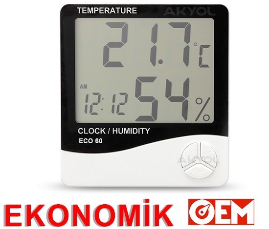 ECO 60 ısı ve nem ölçer; bulunduğu ortamdaki sıcaklık ve nem değerlerini geniş LCD ekranında gösteren, saat alarm özelliği bulunan ekonomik fiyatlı sıcaklık ve nem ölçer çeşididir.
