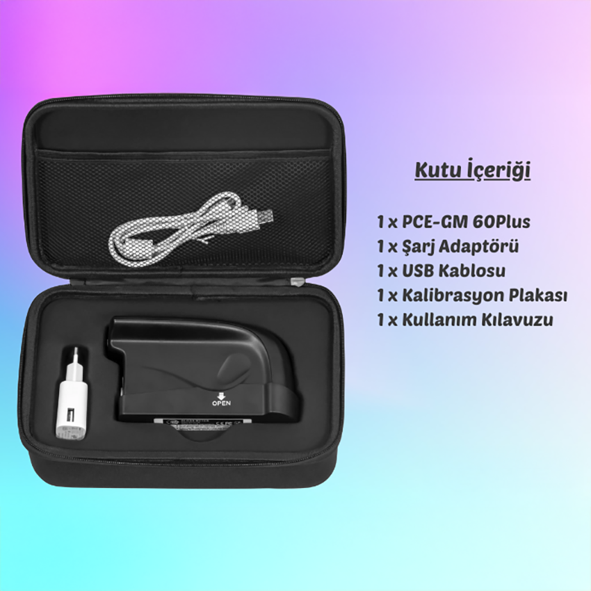 PCE-GM 60Plus, Şarj Adaptörü, USB Kablosu, Kalibrasyon Plakası, Kullanım Kılavuzu