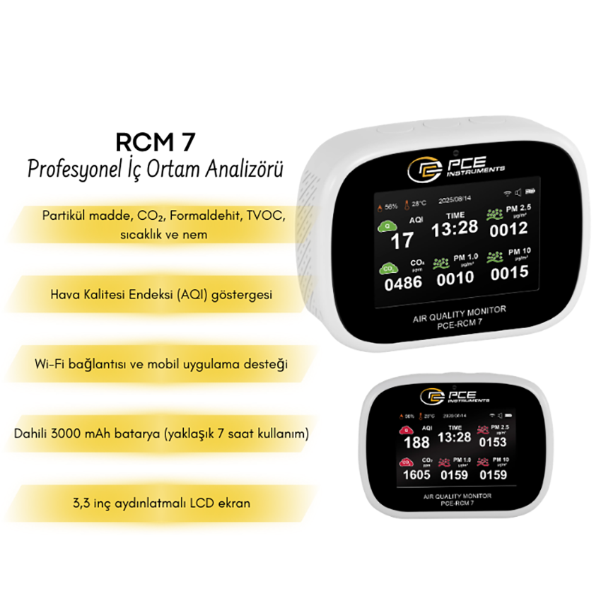 - PCE-RCM 7; 3,3 inç aydınlatmalı LCD ekranı aracılığıyla PM1, PM2.5, PM10, CO₂ (karbondioksit), formaldehit (HCHO) ve uçucu organik bileşikler (TVOC) değerlerini anlık olarak görüntüler. Ayrıca ortam sıcaklığı ve bağıl nem ölçümü yaparak bulunduğunuz alanın hava kalitesini kapsamlı şekilde analiz eder.