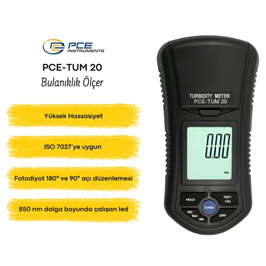 PCE-TUM 20 cihazı; bir sıvının temizliği hakkında fikir elde edilmesini sağlayan, NTU (Nephelometric Turbidity Units) ölçüm birimi ile suyun içerindeki partikülleri tespit ederek bulanıklık seviyesini profesyonel şekilde tespit edebilen ölçüm cihazıdır.