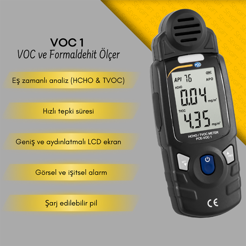 PCE-VOC 1, formaldehit ve TVOC (Toplam Uçucu Organik Bileşik) seviyelerini ölçen taşınabilir bir ölçüm cihazıdır.
