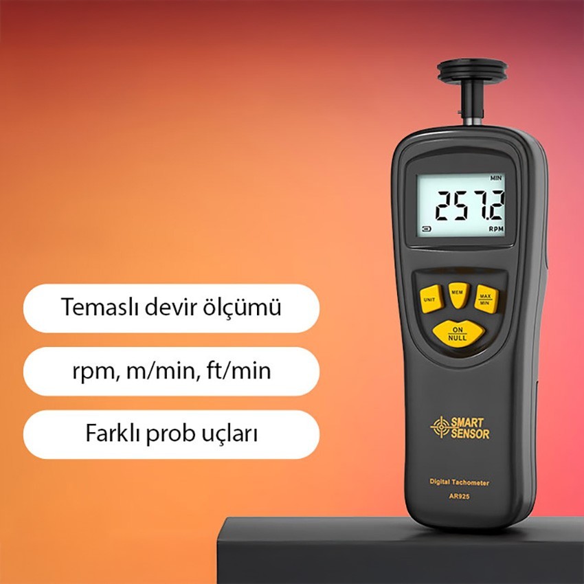 Smart Sensor AR 925 temaslı takometre; Dönen cisimleri, yanında gelen uygun aparatı kullanarak,