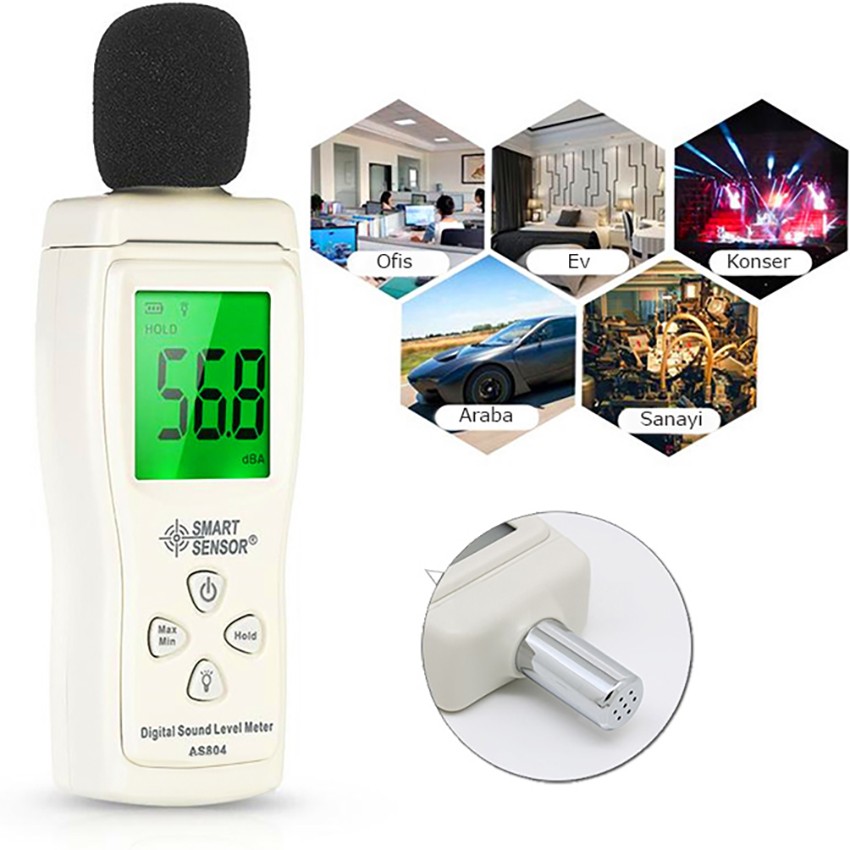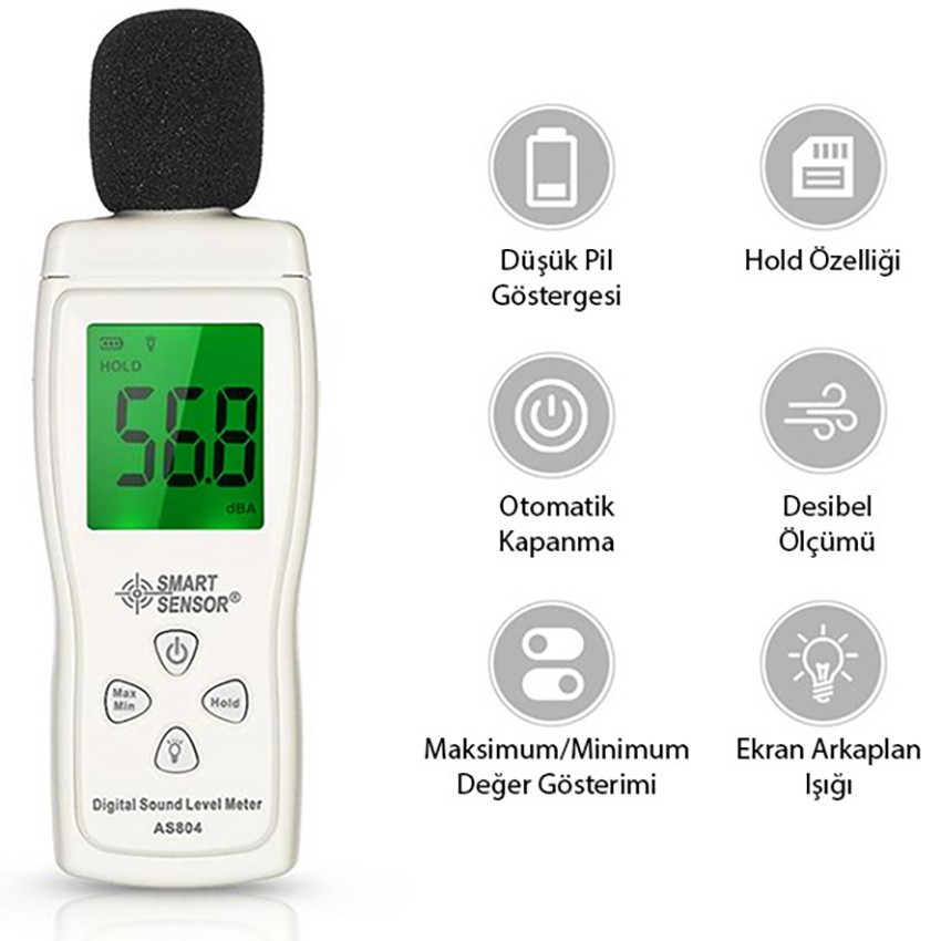 Smart Sensor AS 804 Dijital Ses Ölçer; herhangi bir ortamdaki ses veya gürültü miktarını ölçerek dijital ekranında rakamsal bir değer olarak gösteren kaliteli ses ölçüm cihazıdır.