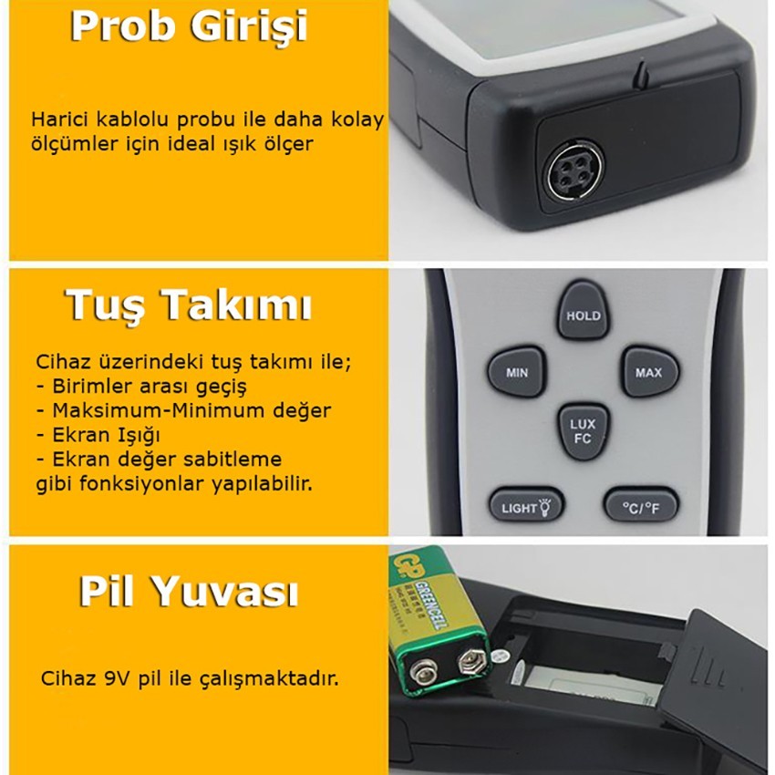Benetech GM1010 ışık ölçüm cihazı; yaygın olarak, kalite kontrol işlemlerinde, okullarda deney ve eğitim işlerinde , inşaat sektöründe, aydınlatma kontrollerinde vb. işlemlerde ışık miktarını tespit etmek için kullanılan, hassas ve taşıması kolay lüksmetredir.