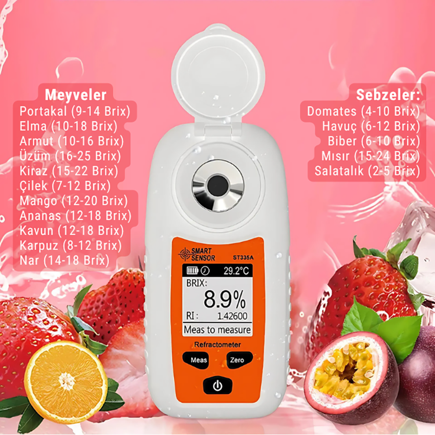 Smart Sensor ST335A dijital refraktometre; sıvı şeker, meyve suları, sebze suları, serinletici içecekler, süt içeren içecekler, gazlı içecekler gibi ürünlerin üretimi ve testi aşamasında kullanılması gereken 0 ile 35 brix arasında ölçüm yapabilme kabiliyeti olan elektronik refraktometre modelidir. ST335A refraktometre cihazı; ayrıca 1.333 ile 1.426 değerleri arasında Refraktif indeks (RI) değeri de ölçebilmektedir.
