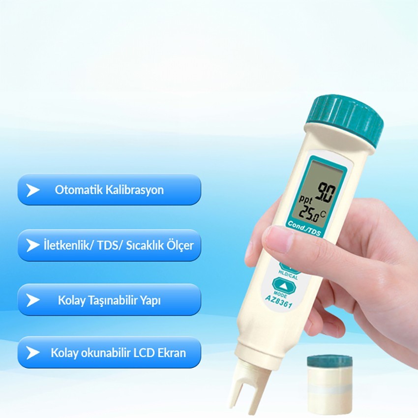 AZ 8361 iletkenlik ölçer ve AZ 8685 ph metre cihazını set şeklinde satın alarak suyun sertliği, kalitesi hakkında fikir sahibi olunabilir, suyun içilip içilemeyeceği öğrenebilmektedir.