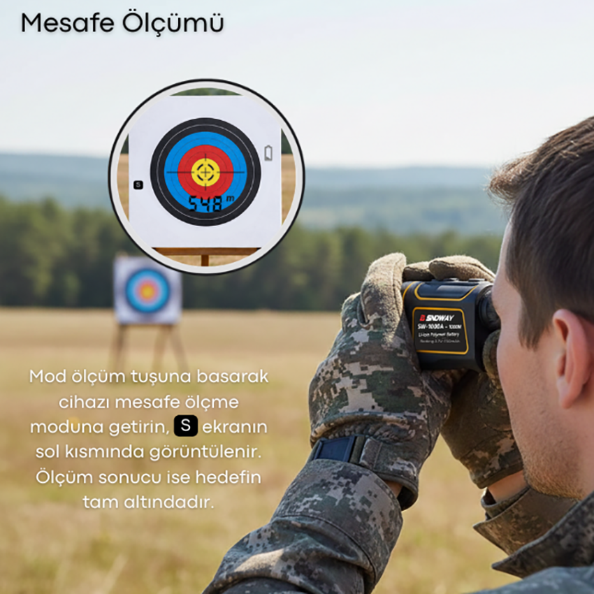 - SW-1000A profesyonel teleskop mesafe ölçer, 1000 metreye kadar ölçüm kapasitesi sayesinde geniş açık alanlarda, golf sahalarında, arazi çalışmalarında ve avcılık uygulamalarında uzak hedeflerin mesafesini güvenilir ve tekrarlanabilir sonuçlarla belirlemenize imkân tanır.