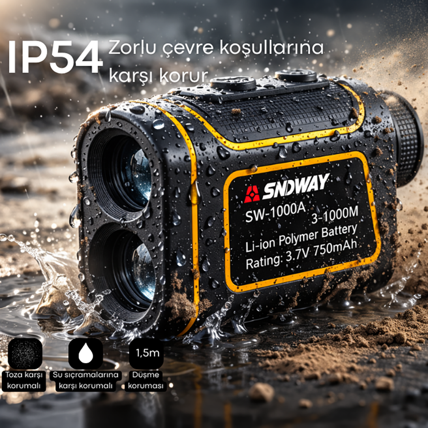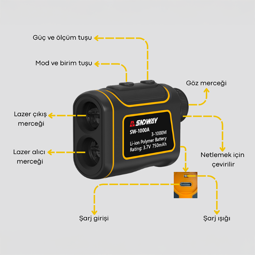 SW-1000A, 1000 metreye kadar hassas ölçüm yapabilen profesyonel bir lazer mesafe ölçerdir. Teleskopik optik sistemi sayesinde
