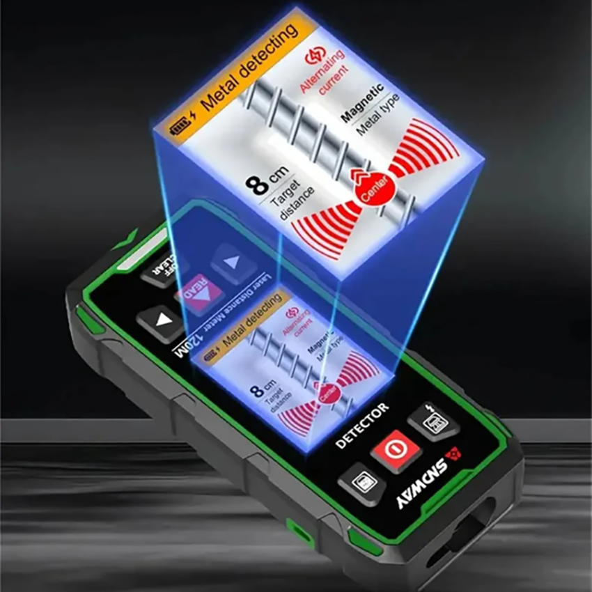 SNDWAY SW-6100GT multi ölçüm cihazı, 120 m’ye kadar uzaklıklarda ±2 mm hassasiyetle ölçüm yapabilen gelişmiş bir lazermetredir ve 2,4″ renkli ekranı ile mesafe, alan, hacim ve Pisagor hesaplamalarını hızlı ve net şekilde gösterir. Ayrıca entegre duvar içi tarama dedektörü sayesinde ahşap, metal ve elektrik kablolarını duvar içinde tespit ederek hem ölçüm hem de yapı içi malzeme bulma ihtiyaçlarını tek cihazda toplar.