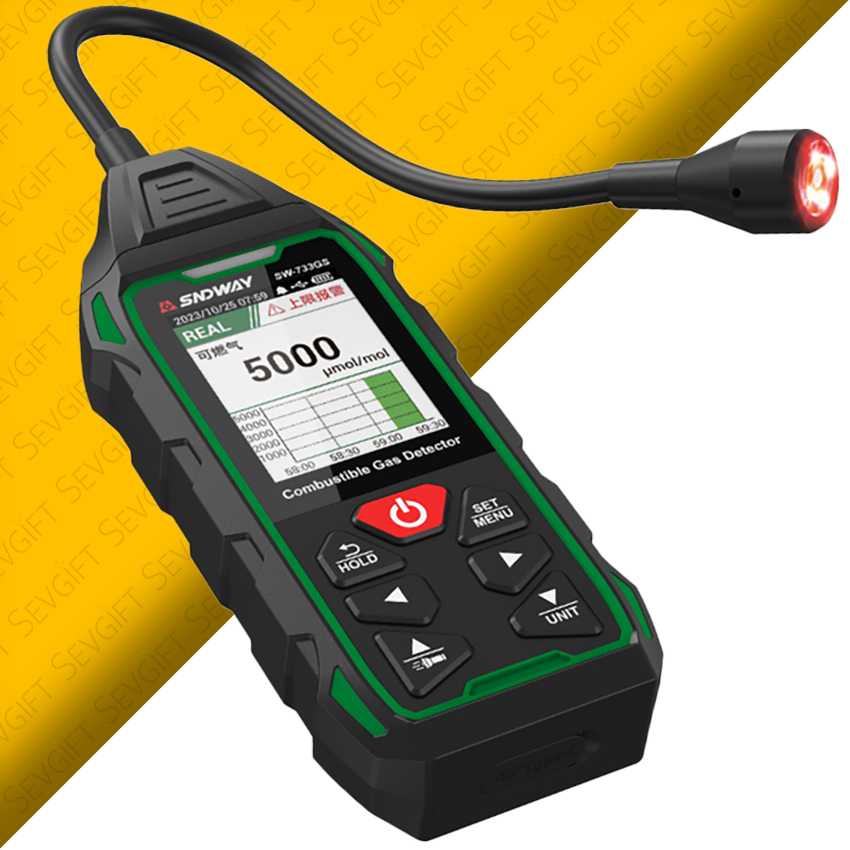 - Sndway SW-733GS, metan (doğalgaz), propan, bütan, LPG ve şehir gazı gibi yanıcı gazların genel tespiti için geliştirilmiş profesyonel bir gaz dedektörüdür.