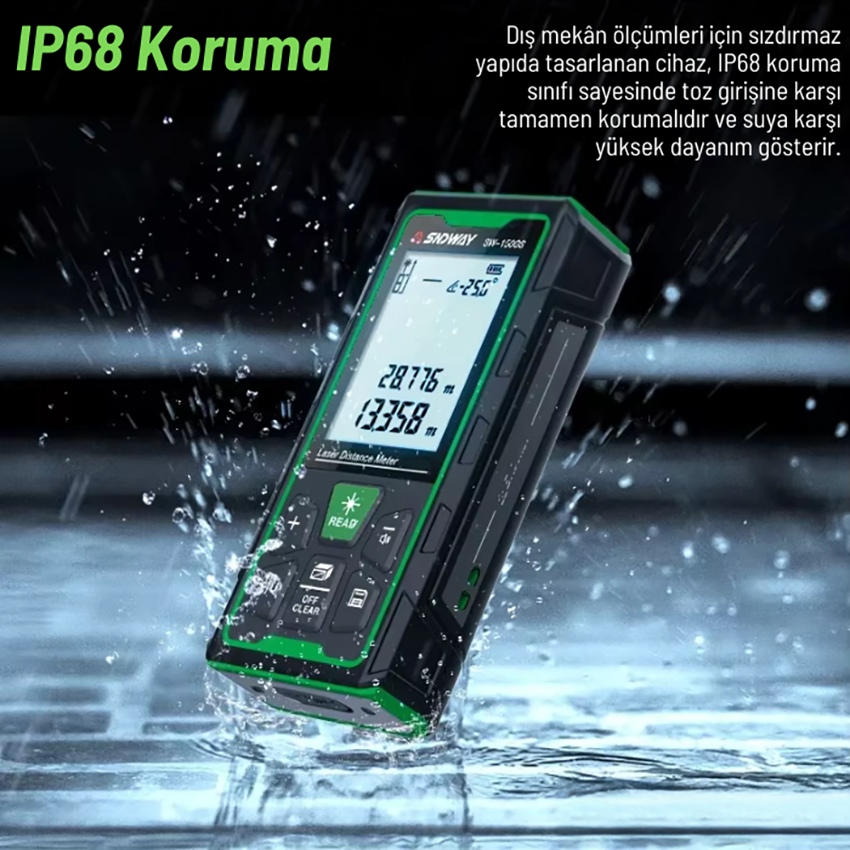 - SW-80GS dayanıklı lazermetre, IP68 koruma sınıfı sayesinde toz girişine karşı tam yalıtım sağlar ve suya daldırılma gibi zorlu saha koşullarında dahi güvenle kullanılabilir. Bu yüksek koruma seviyesi, cihazı şantiye, dış cephe ve endüstriyel ölçüm uygulamalarında uzun ömürlü ve dayanıklı bir profesyonel ölçüm aracı haline getirir.
