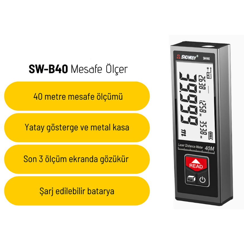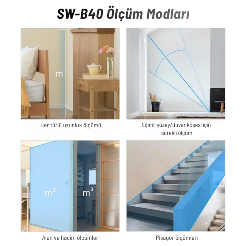 - 40 metreye kadar hassas mesafe ölçümü sunan SW-B40; sürekli ölçüm, alan ve hacim hesaplama ile Pisagor ölçüm modları sayesinde inşaat, montaj, iç mekân ölçümü ve teknik uygulamalarda pratik kullanım sağlar.
