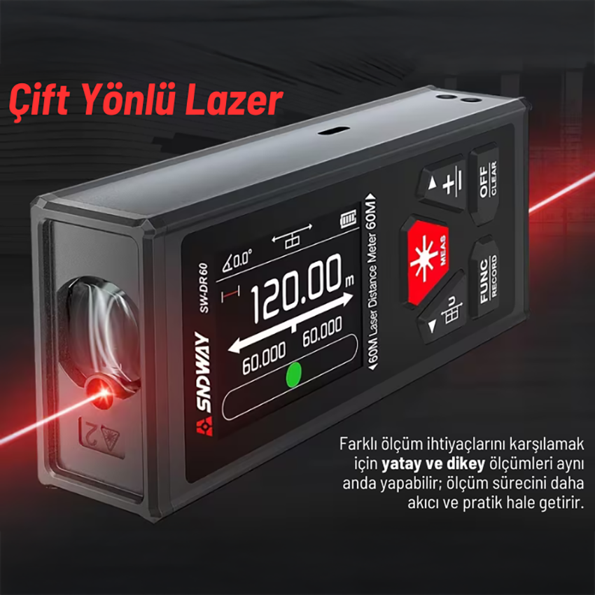 SNDWAY SW-DR60 lazermetre; ön ve arka yüzeyinde konumlandırılmış iki ayrı mesafe ölçüm sensörü sayesinde,