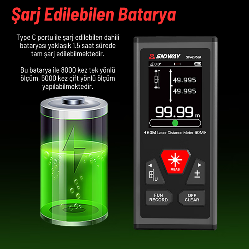 Sndway SW-DR60 lazermetre cihazı Type C portu ile şarj edilebilen dahili bataryaya sahiptir.