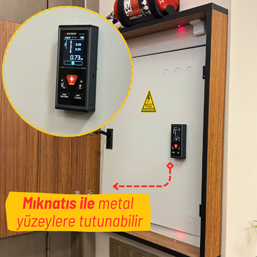 SNDWAY SW-DR60 lazermetrenin arka yüzeyinde yer alan manyetik tutunma özelliği, metal yüzeylere zahmetsizce sabitlenerek