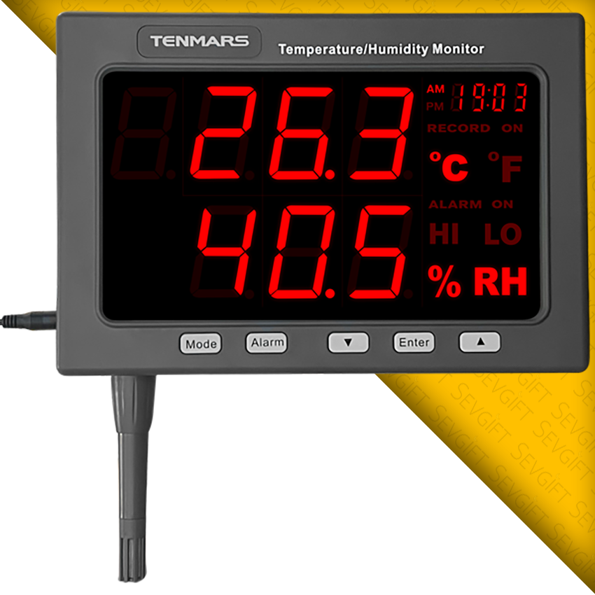 Tenmars TM-185D ışıklı gösterge; kapalı alanlarda yaklaşık 25 metre mesafeden dahi rahatlıkla okunabilen yüksek parlaklıktaki kırmızı LED ekranı ile sıcaklık, nem ve saat bilgilerini eşzamanlı olarak görüntüleyebilen, aynı zamanda dahili veri kayıt özelliğiyle ölçüm verilerini arşivleyebilen gelişmiş bir izleme cihazıdır.