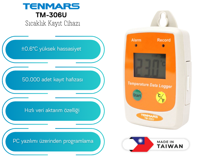 Tenmars TM-185D ışıklı gösterge; kapalı alanlarda yaklaşık 25 metre mesafeden dahi rahatlıkla okunabilen yüksek parlaklıktaki kırmızı LED ekranı ile sıcaklık, nem ve saat bilgilerini eşzamanlı olarak görüntüleyebilen, aynı zamanda dahili veri kayıt özelliğiyle ölçüm verilerini arşivleyebilen gelişmiş bir izleme cihazıdır.